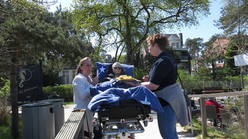 Wunscherfüllerin Maike und Wunscherfüller Mirko steuerten Rudis Dünenimbiss als perfekt gelegenes erstes Ziel an, sehr freundlich wurde man dort willkommen geheißen. Frau B. genoss den Blick aufs Wasser sehr, man merkte, wie sie alles in sich aufsog, Kraft tankte und immer mehr auftaute. Auch die Pommes schmeckten ihr, so dass sie entschied, noch ein Eis essen zu gehen. Das Café Wichtig lud die ganze Gruppe dazu ein. Nun ließ sich Frau B. auch stolz herumfahren und suchte sich in einem Geschäft noch zwei Tücher aus.