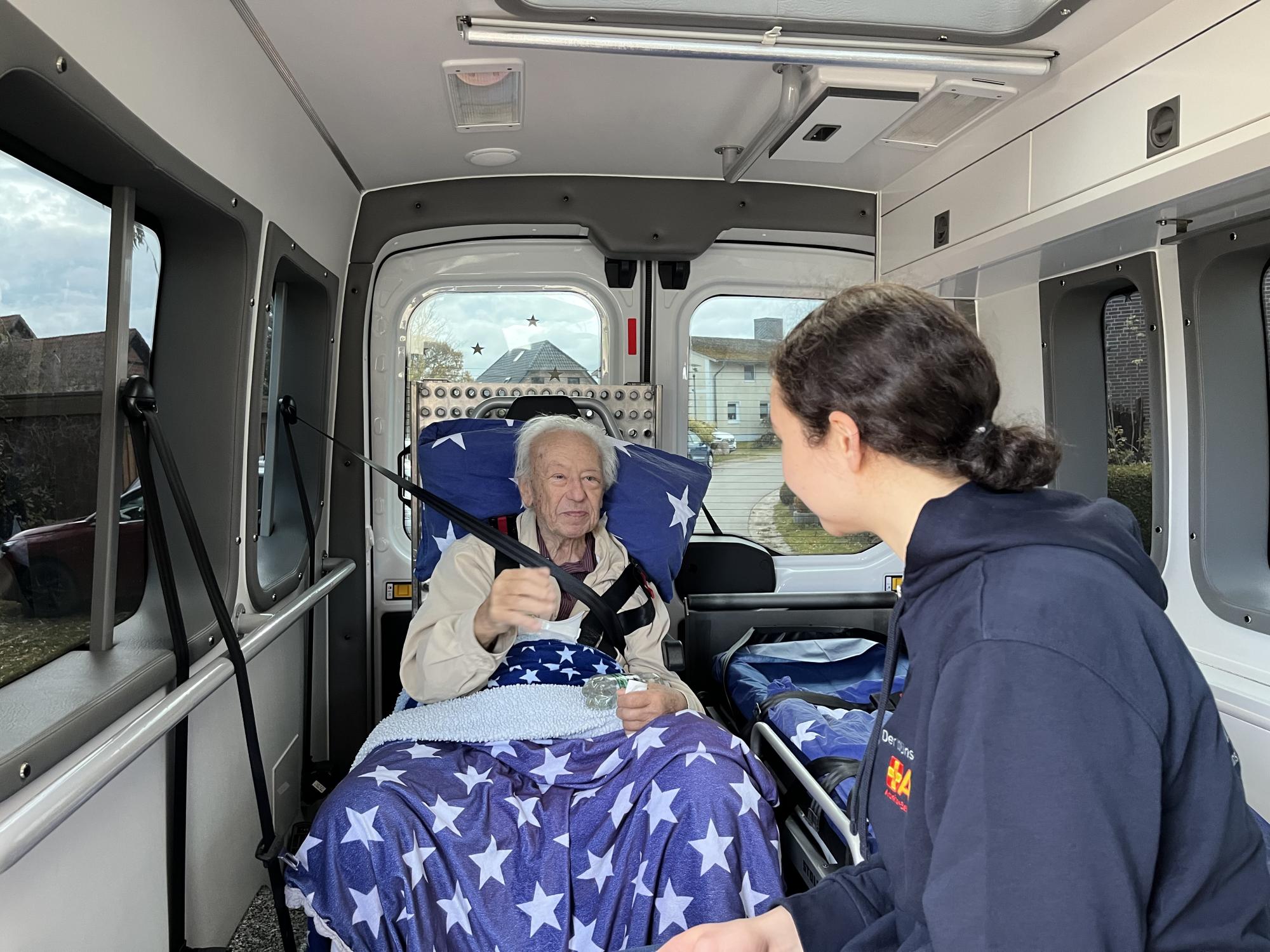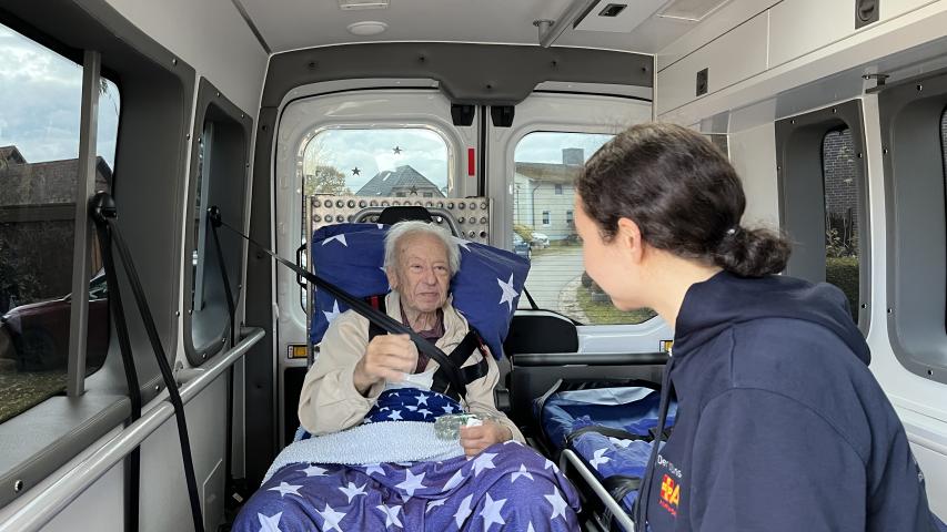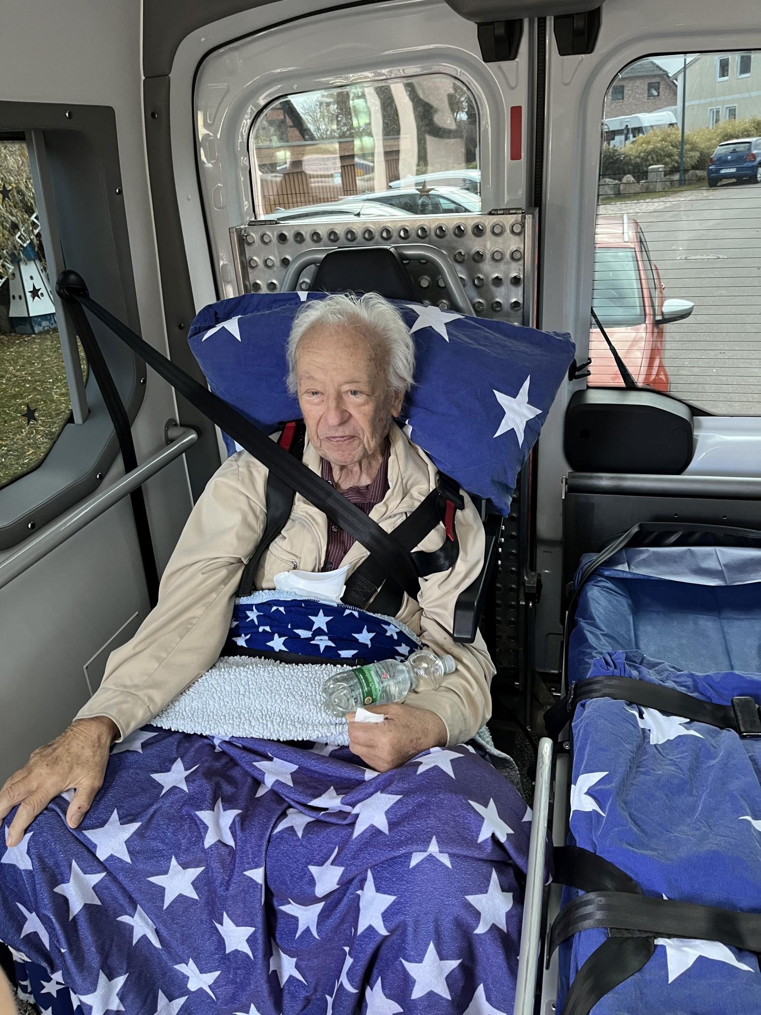 Herr T. und sein Enkel machen es sich hinten im Wünschewagen bequem, während die Tochter und deren Mann uns im Pkw begleiten.