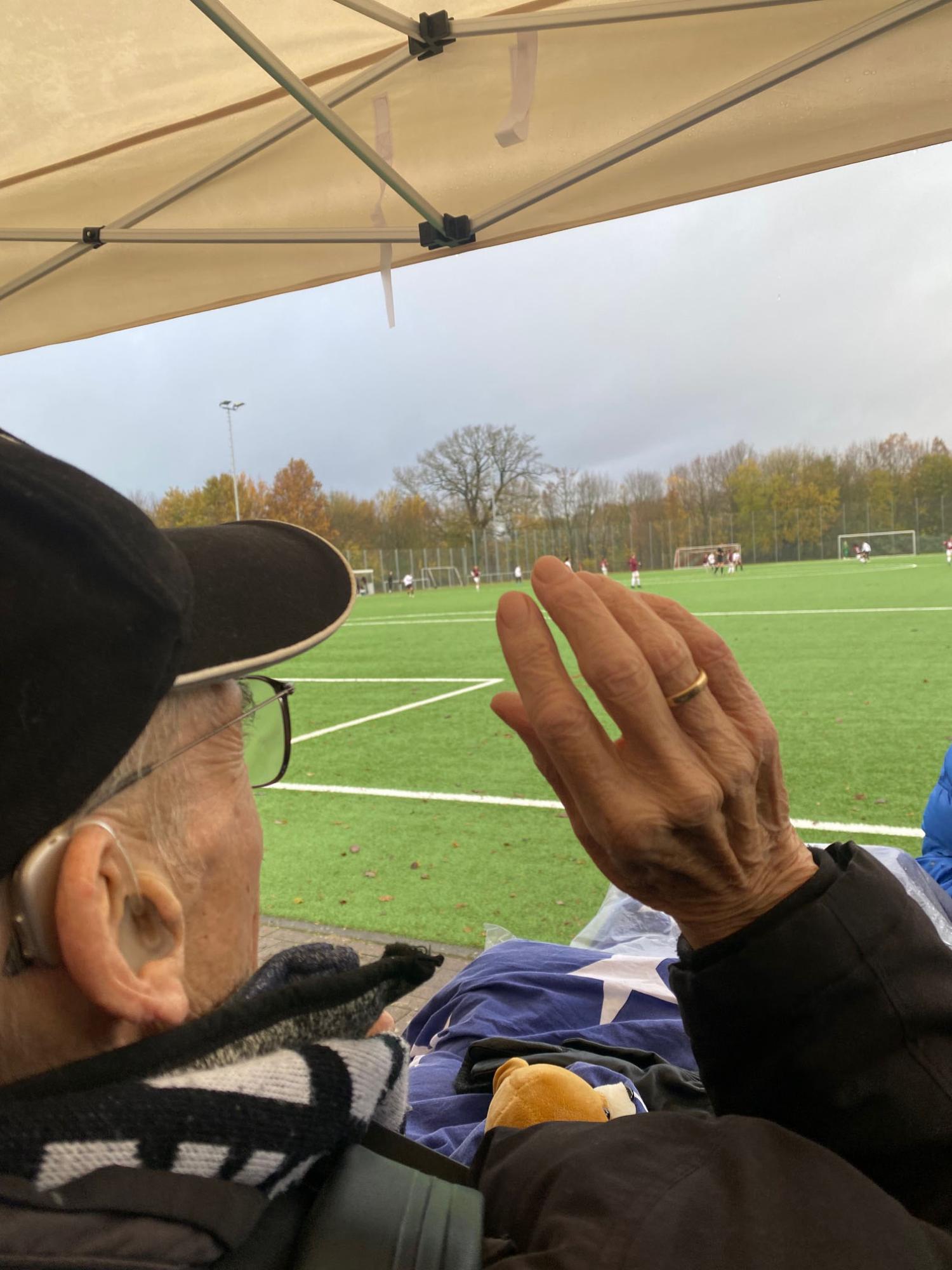 Nach einer herzlichen Begrüßung und einem flotten Spruch seitens unseres Fahrgastes ging es zum nahegelegenen Sportplatz nach Kronshagen bei Kiel. Gut geschützt unterm Zelt und warm in unsere Decke eingepackt bekam Ehren-Fan Herr M. einen Logenplatz. Nicht sein Stammplatz, den er bei jedem Spiel von Enkel Lasse eingenommen hatte, aber exklusiv für ihn.