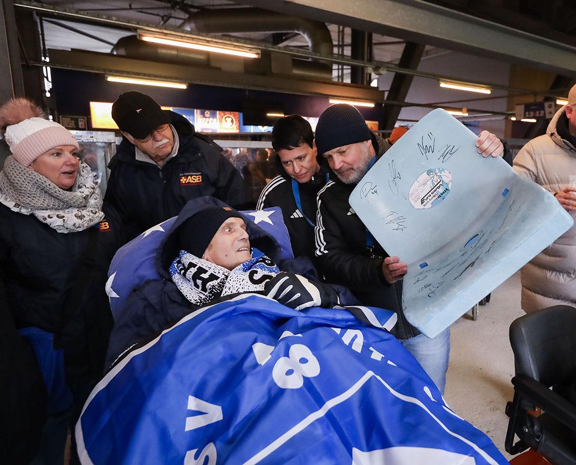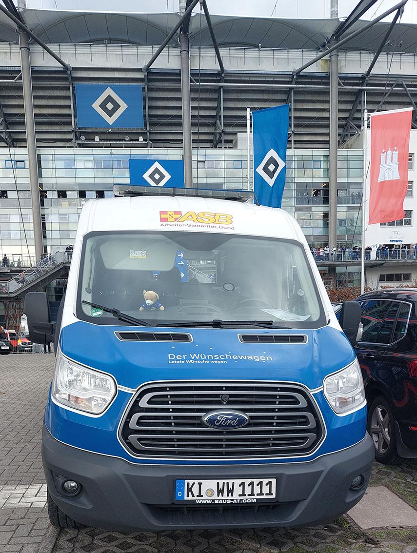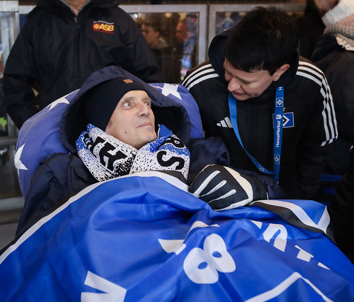 An diesem Morgen sollte die Fahrt nach Hamburg in das Volksparkstadion zum Fußballspiel SV gegen Elversberg gehen. Fröhlich wurden wir von den Mitarbeiter:innen des Albertinen-Hospiz in Norderstedt begrüßt. Sie führten uns zu einem echten HSV-Fan und seiner Frau, die uns mit strahlenden Augen begrüßten. Sie freuten sich sehr, dass der ASB den Wunsch von Herrn M. erfüllen konnte.