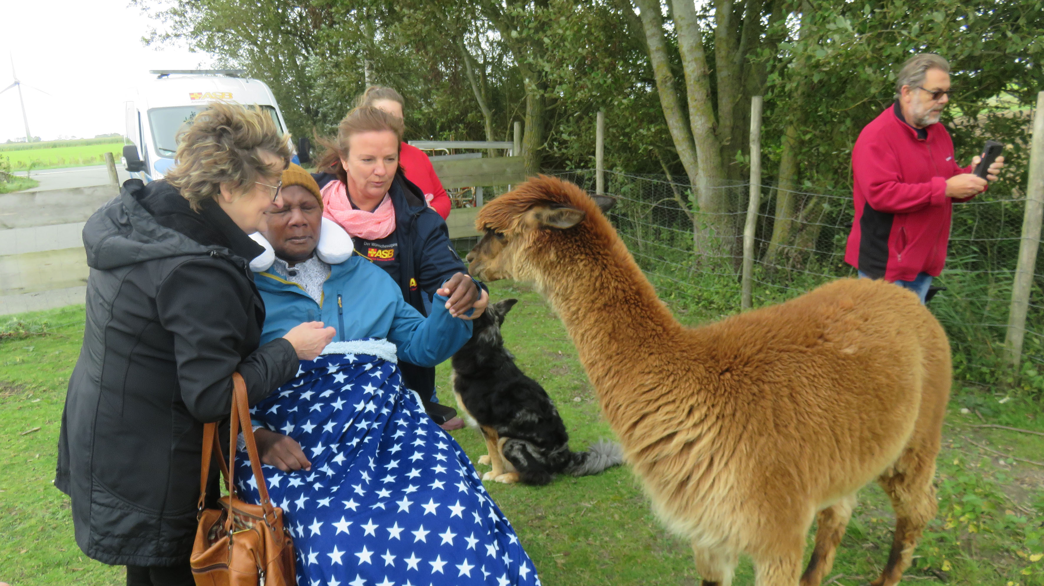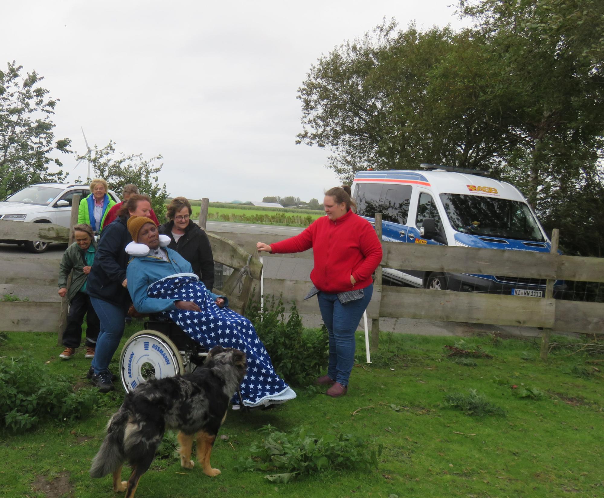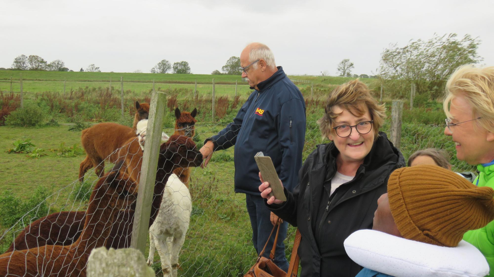 Pünktlich, wie es der Fahrtenplan vorsah, haben wir die Angehörigen Beate und Britta abgeholt und anschließend Kenneth, unseren heutigen Fahrgast. In kurzer Zeit haben wir uns ein wenig ausgetauscht und konnten uns auf die Fahrt einstellen. Kenneth war früher oft auf der Halbinsel Nordstrand und vor kurzem, als er noch reden konnte, äußerte er den Wunsch, auf den Alpaka-Hof und anschließend zum Strand zu fahren. Seine engsten Freunde haben an den Wunsch gedacht und wollten ihn mit uns erfüllen.