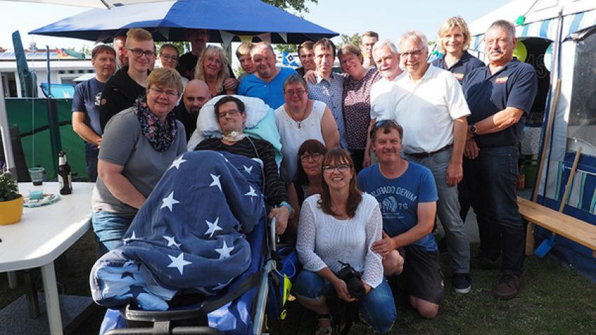 Hier wartete bereits die Familie und begleitete den Wünschewagen zum richtigen Platz. Am Wohnwagen der Familie P. nahmen viele Freunde und weitere Familienmitglieder den schwerkranken 52-Jährigen herzlich in Empfang.