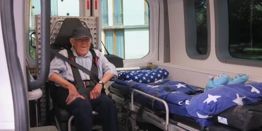 Der 91-jährige ist schwer krank und kann nur wenige Schritte mit dem Rollator gehen. Im Rollstuhl ist er aber mobil und hat sich deshalb die Fahrt mit dem ASB-Wünschewagen zugetraut, genauso, wie es im unserem Motto heißt: „Letzte Wünsche wagen!“